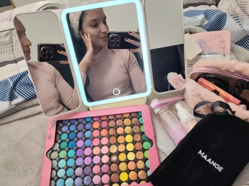 Antes me maquillaba con el espejo del baño y siempre quedaba con sombras 😅, pero con este se ve todo clarito. El diseño es hermoso y ocupa poco espacio.
